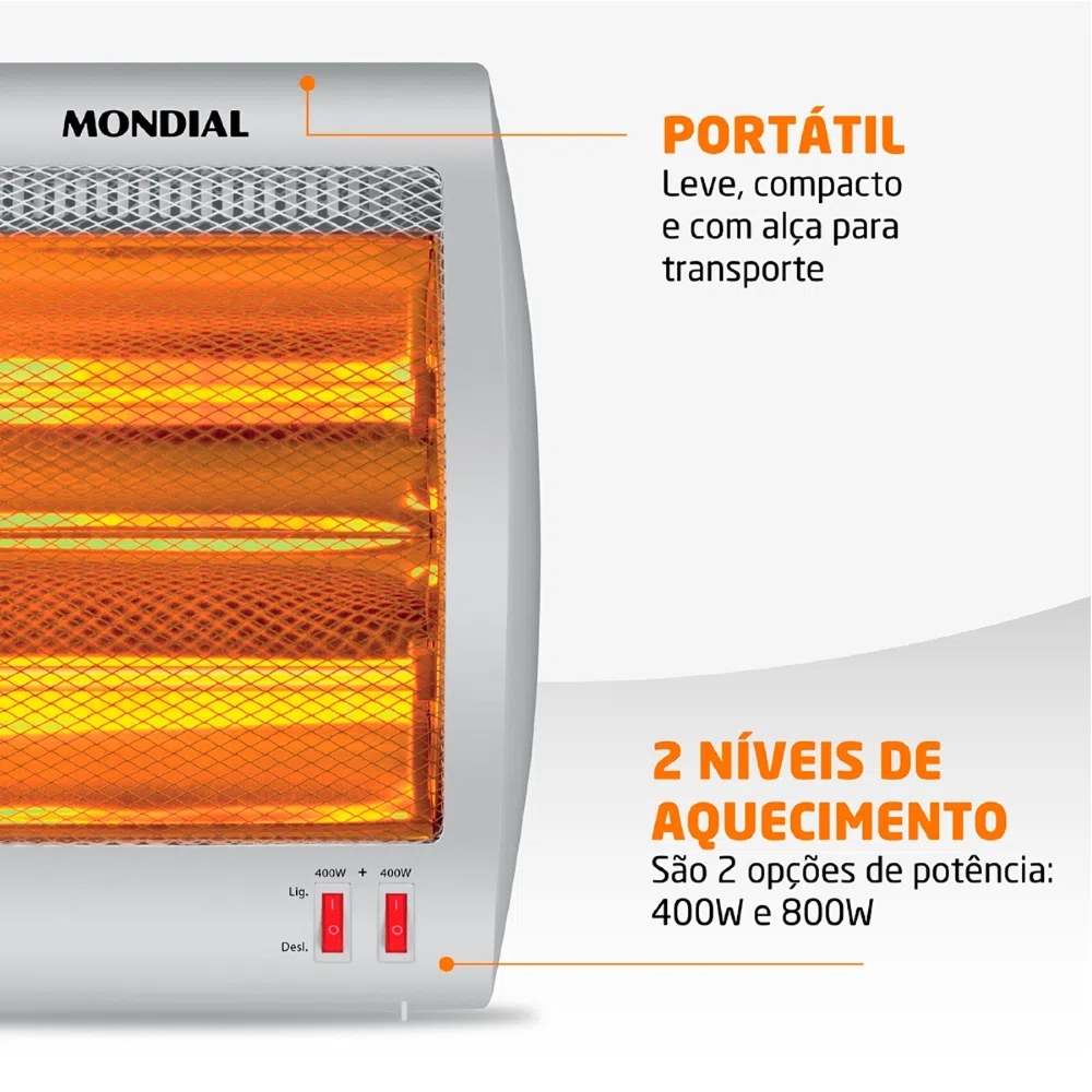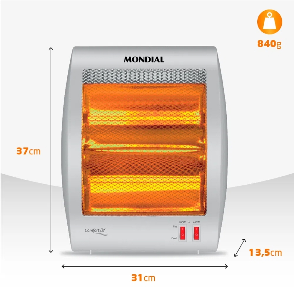 A Mondial é uma empresa nacional que possui mais de 20 anos de história e atuação sólida no mercado global, através da criação de produtos e soluções fabricadas no mais alto nível de qualidade, tecnologia, durabilidade e eficácia. Com o foco de satisfazer as necessidades dos clientes e as demandas do mercado, a Mondial se compromete em disponibilizar a excelência e a total satisfação por meio do novo Aquecedor Halógeno Comfort Air Branco 220V 0,8Kw/h 800W A-09.