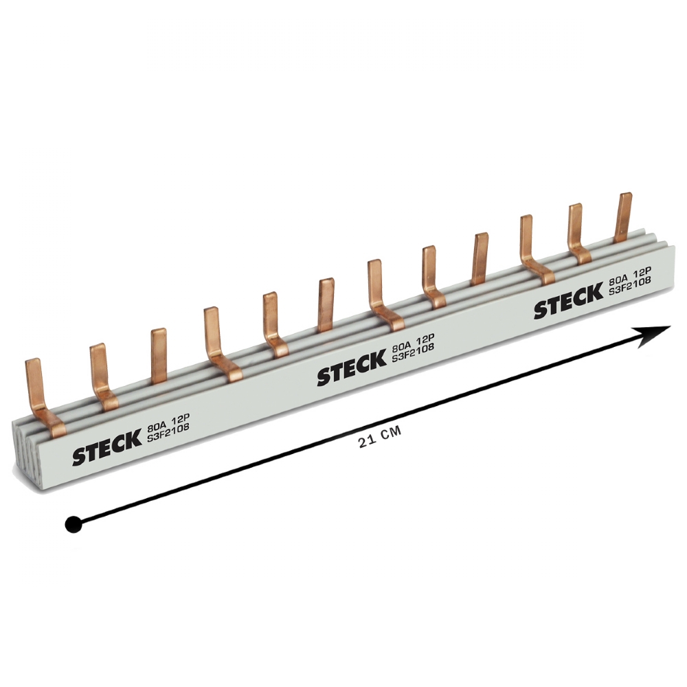 O Barramento Trifásico Fase Din 12 Polos 80a da Steck facilita a interligação dos dispositivos de proteção no quadro de distribuição até 80a.