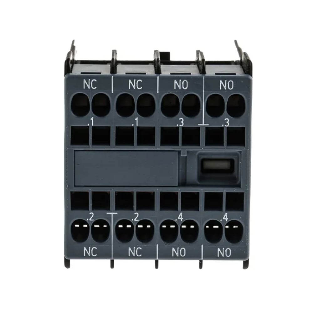Interruptor auxiliar no lado frontal, 2 NA + 2 NF caminho de corrente 1 NF, 1 NF, 1 NA, 1 NA para 3RH2 e 3RT2 conexão de mola .1/.2, .1/.2, .3/.4, .3/.4