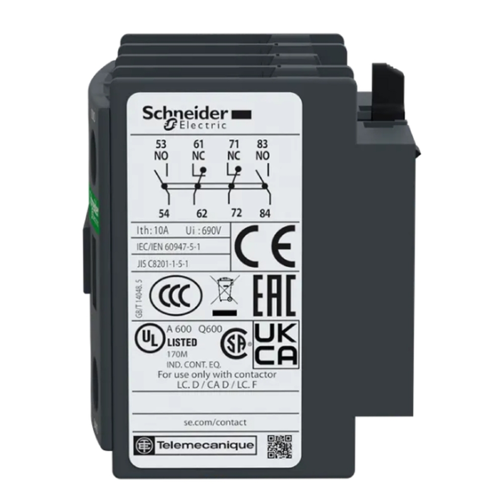 Ele fornece contatos 2NA+2NF (certificado de espelho NF) classificado até 10A/690V CA e conexão por terminais de grampo de parafuso.