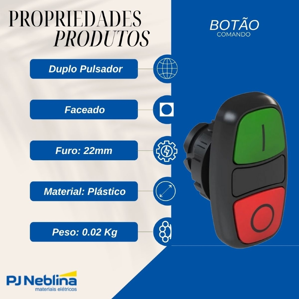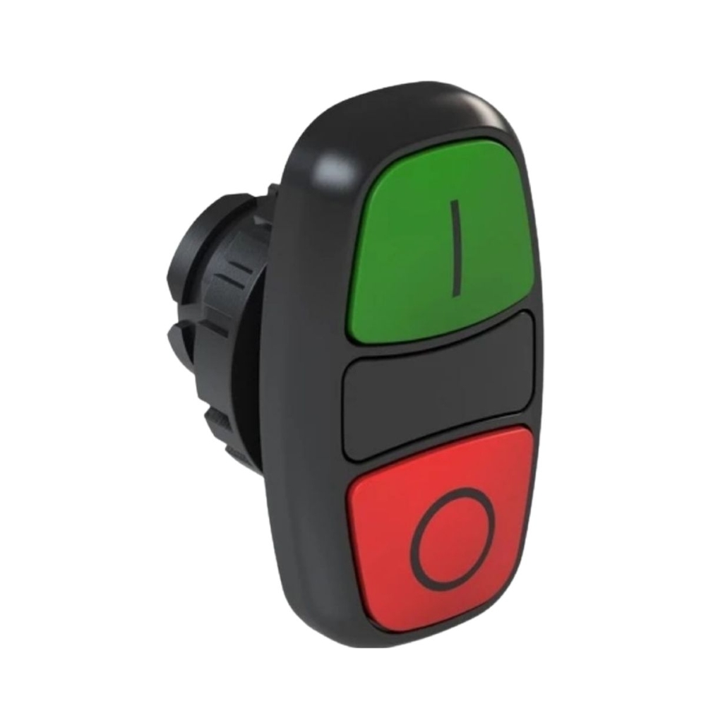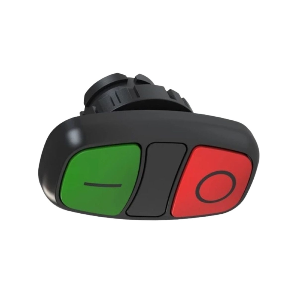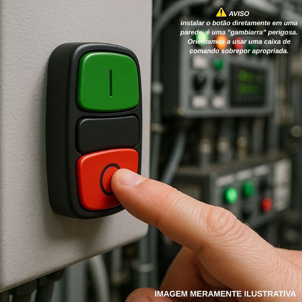 • Botão de comando duplo faceado com cores verde e vermelha para funções liga/desliga (I/O).