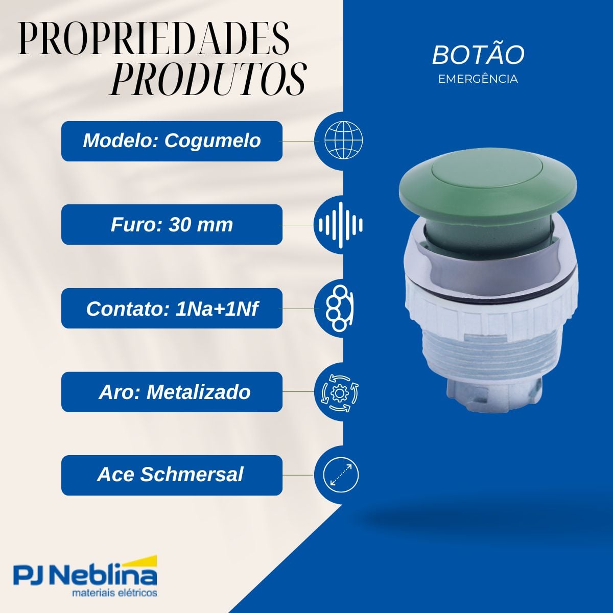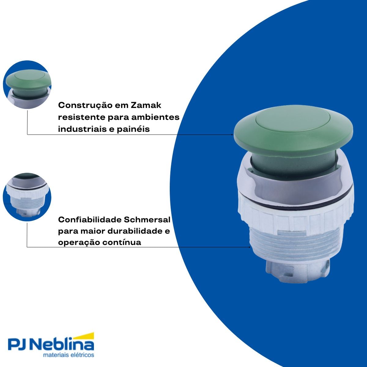 Botão Emergência Cogumelo 36 mm Pulsador 30 mm Zamak Verde 1Na+1Nf - Ace Schmersal - Código Fabricante: 12841105