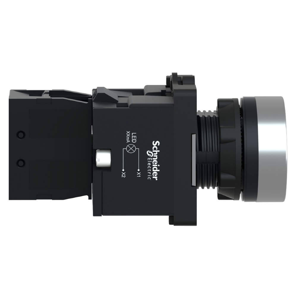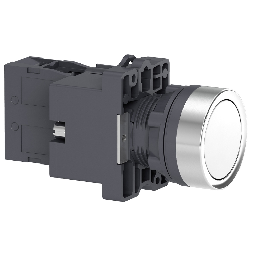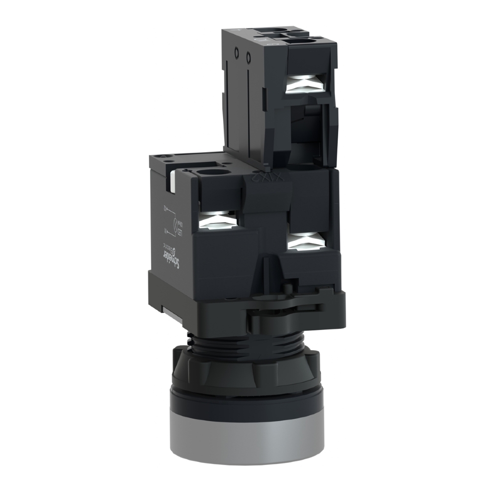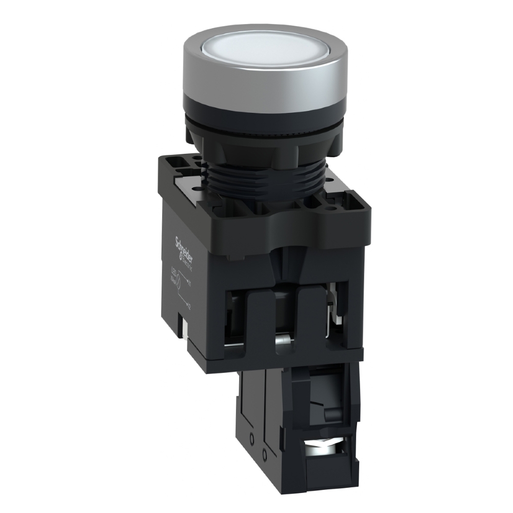 É um botão modular branco embutido e iluminado. Este botão funciona com um mecanismo de retorno/impulso por mola. Ele é iluminado com LED integrado fornecendo uma interface ergonômica e visual para controlar máquinas.