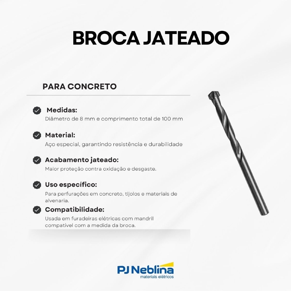 • Medidas: Diâmetro de 8 mm e comprimento total de 100 mm – ideal para perfurações mais profundas em alvenaria.