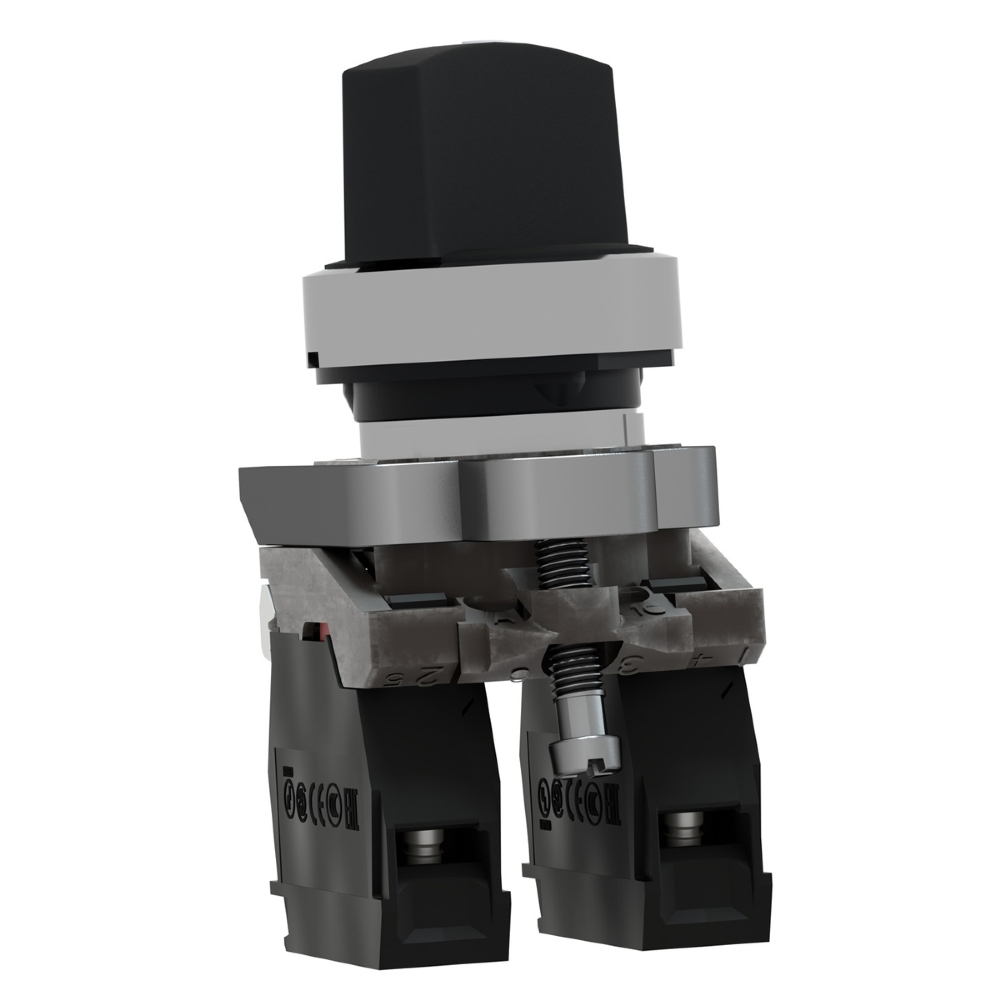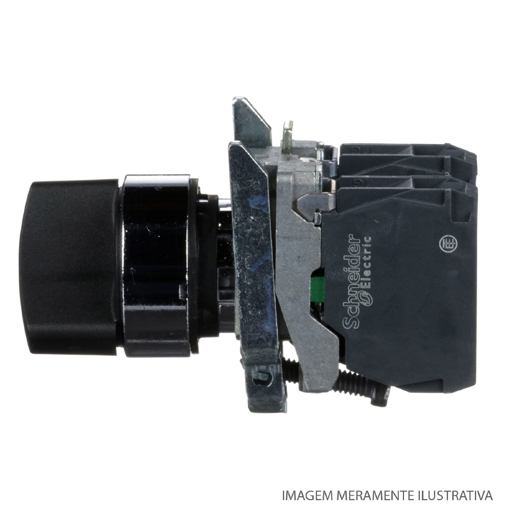A XB4BD25 é uma chave seletora metálica preta da linha Harmony XB4, possui 2 posições fixas, opera com mecanismo de desbloqueio por manopla curta, além de ter um contato Normalmente Aberto e um Normalmente Fechado.