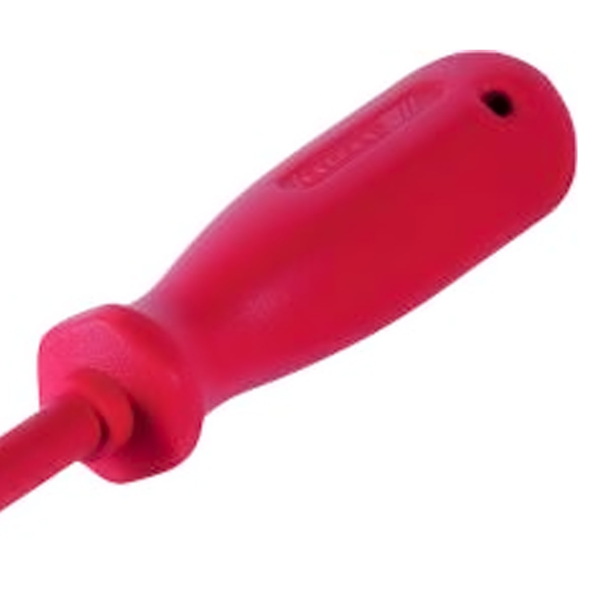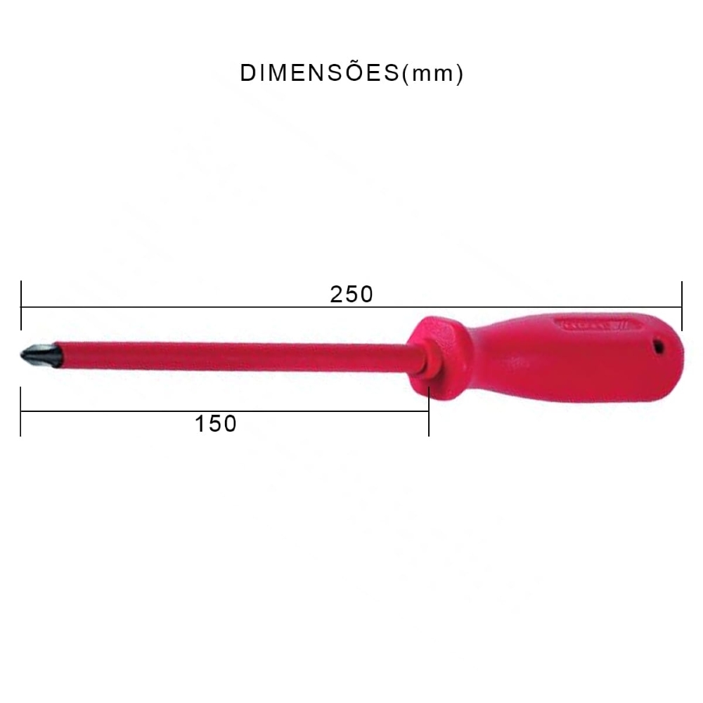 Cabo ergonômico, possui identificação do encaixe. Largura da ponta é igual ao diâmetro da haste, possibilitando o uso em bornes e terminais na linha elétrica e eletrônica. Chave com haste redonda e resistente, com perfil de encaixe para parafusos tipo fenda cruzada “Phillips”.