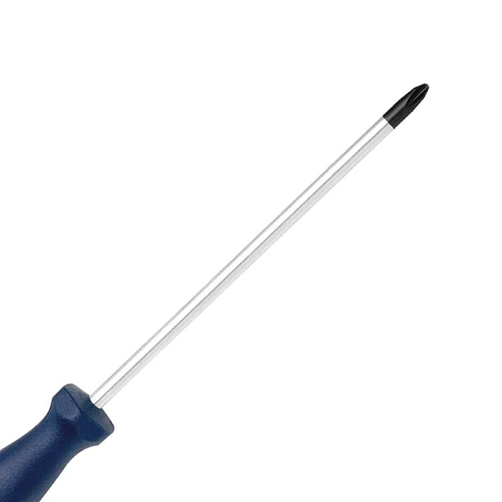 Haste em aço Gedore-Vanadium e cabo em polímero na cor azul padrão Gedore. Haste com acabamento niquelado e cromado, com ponta escurecida. Cabo ergonômico. Chave com haste redonda e resistente, com perfil de encaixe para parafusos tipo fenda cruzada “Phillips”.