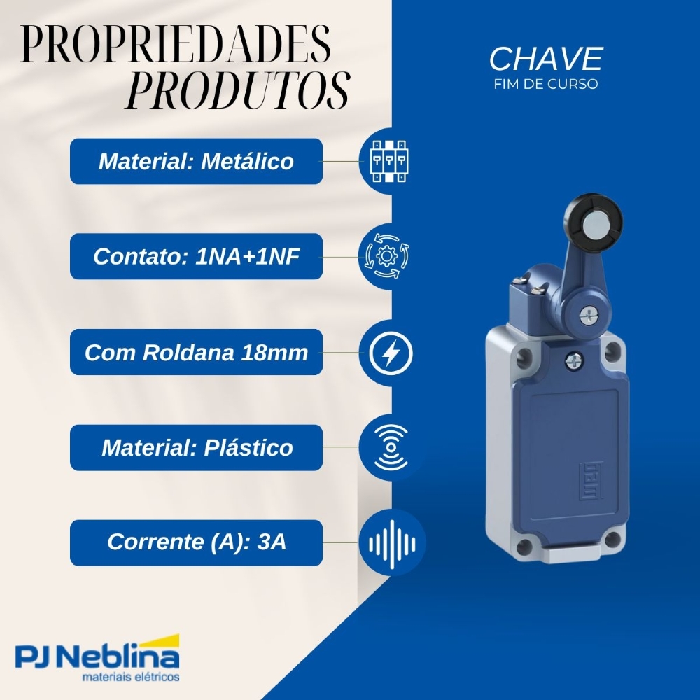 • Chave fim de curso com alavanca e roldana de 18âmm, garantindo acionamento suave e preciso.