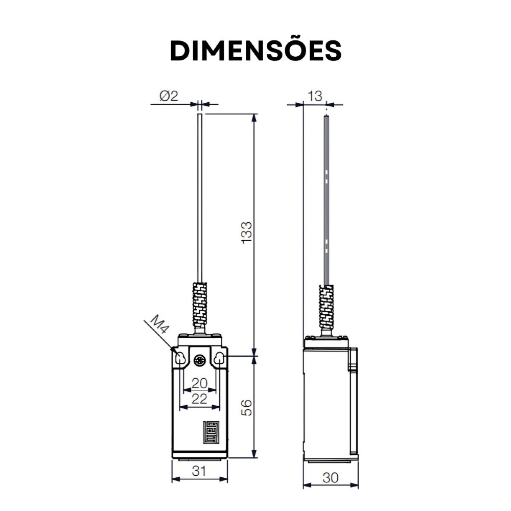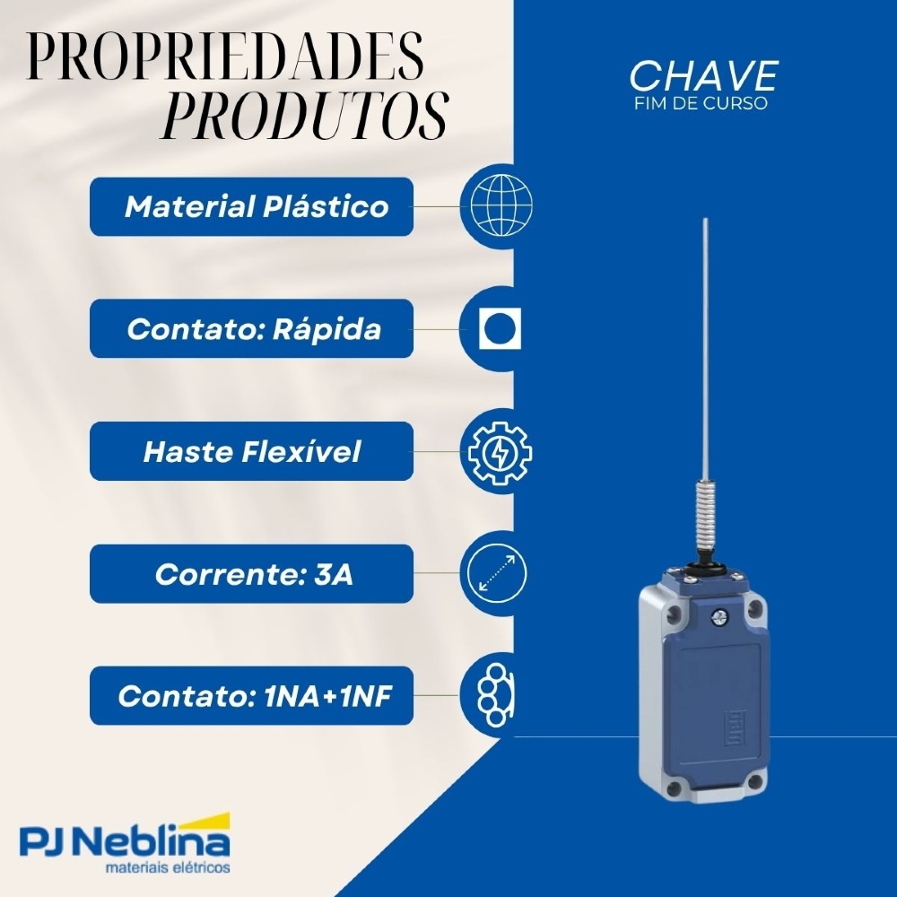 • Chave fim de curso com haste flexível e mola, ideal para acionamentos suaves.