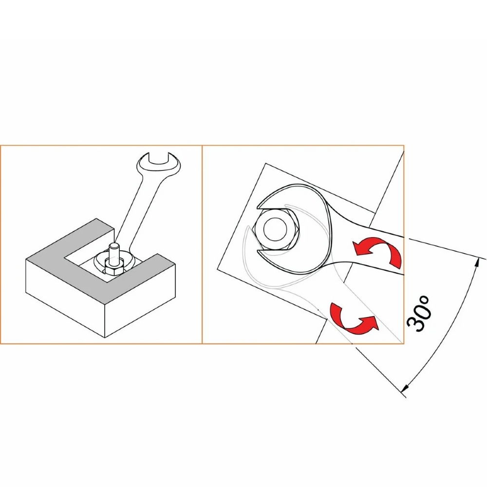 Use a chave perpendicular ao eixo do parafuso e/ou porca. Isto aumenta a vida útil da ferramenta e torna a operação mais segura.