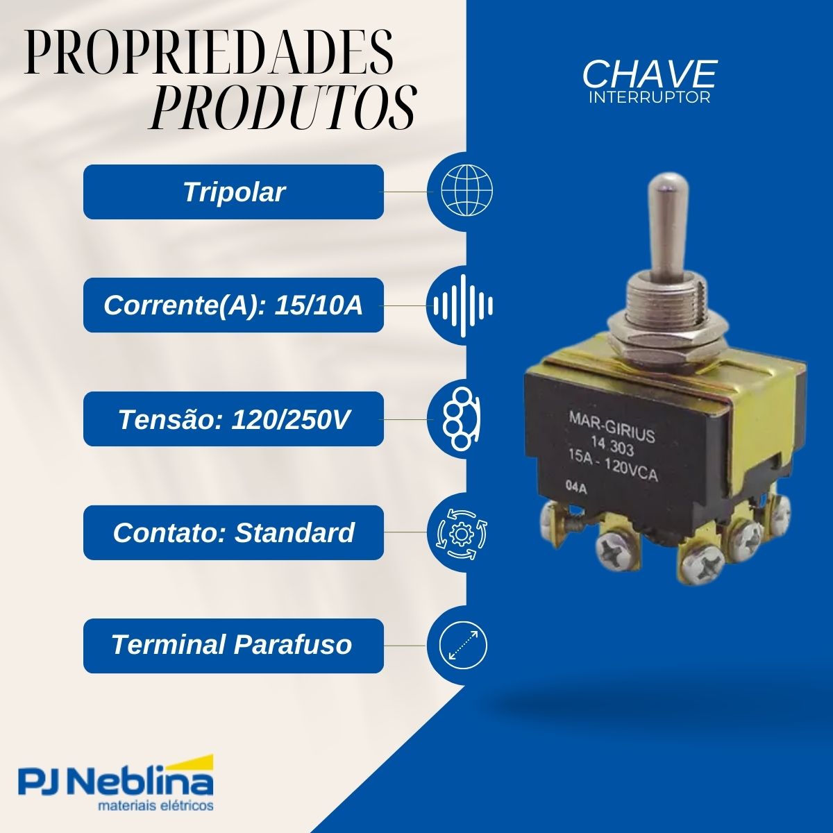 Chave Interruptor Alavanca Metálica Tripolar Liga/Desliga 15/10A 120/250V Cromada Standard Terminal Parafuso - Margirius - Código Fabricante: A1B1P1Q