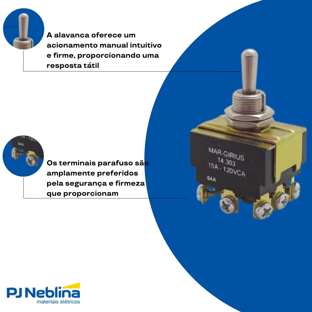 – Tipo: Chave Interruptor de Alavanca (Toggle Switch). Possui um atuador em forma de alavanca para alternar entre as posições.