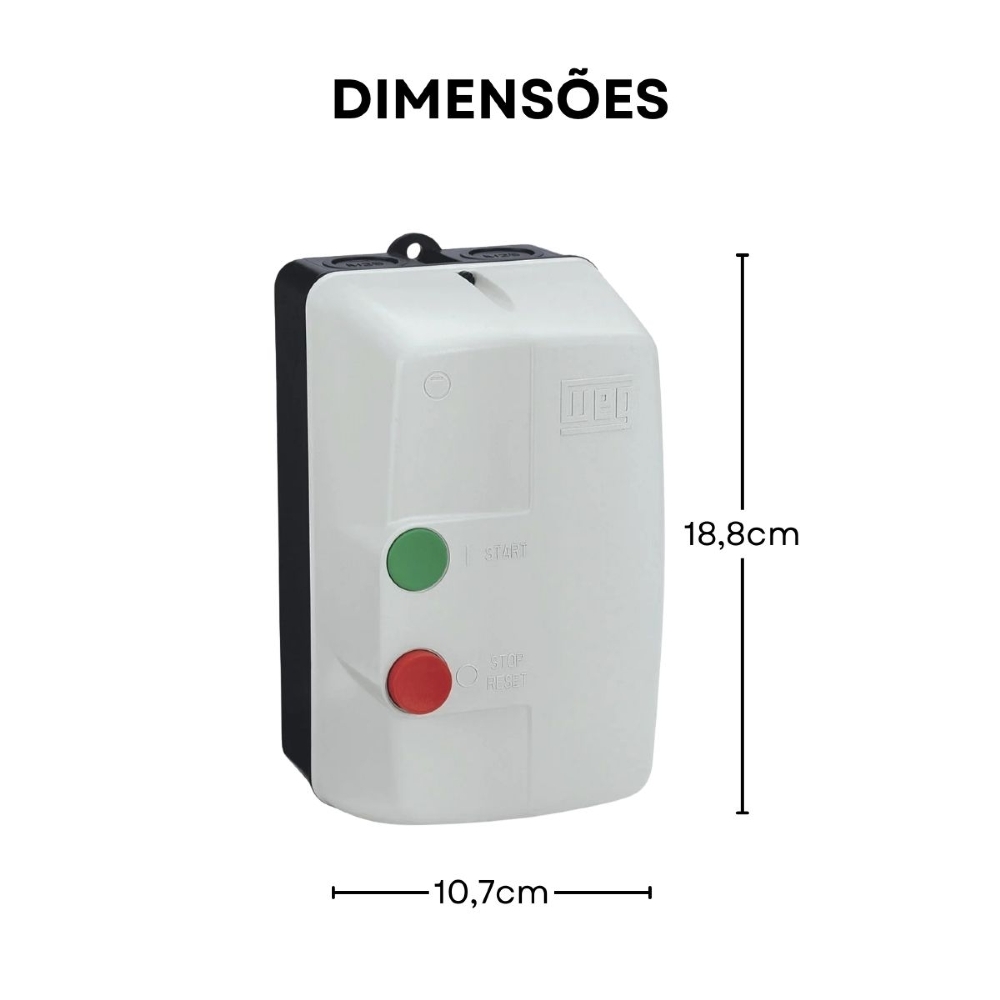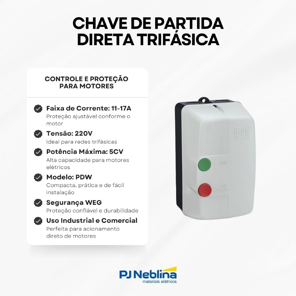 • Chave de partida direta trifásica, projetada para acionar motores de forma segura e eficiente.
