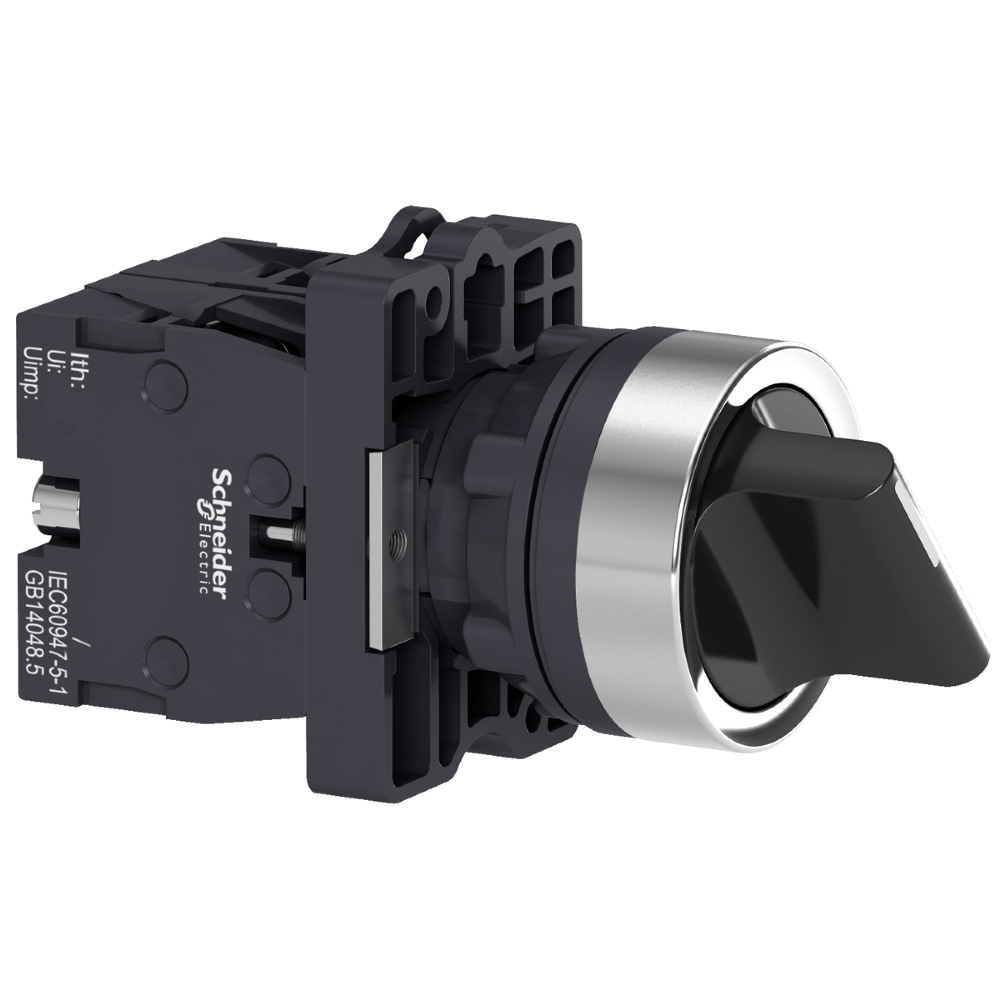 Esta chave seletora possui manopla curta padrão. Vem com 2 posições fixas e opera com mecanismo de retenção. Fornece uma interface versátil para controlar máquinas. Possui 1 contato NA e 1 contato NF com operação de interrupção lenta. Este é um interruptor de plástico com uma moldura com design de anel de aparência metálica. É um produto com classificação IP54 e vem com certificação CE, CCC e EAC em conformidade com os padrões GB 14048.1, IEC 60947-1, GB 14048.5 e IEC 60947-5-1.