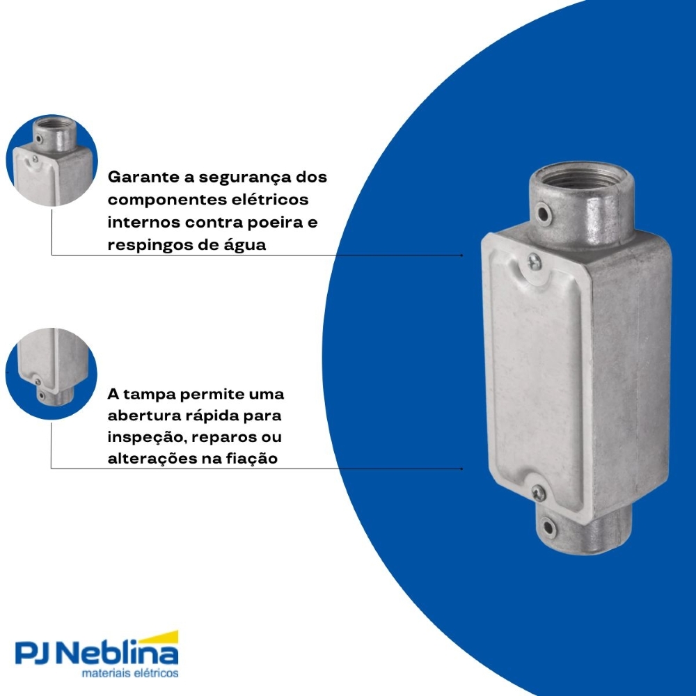 - Tipo "C": Possui três aberturas (uma de passagem e duas para conexão em linha reta), ideal para derivações ou acesso em linha.