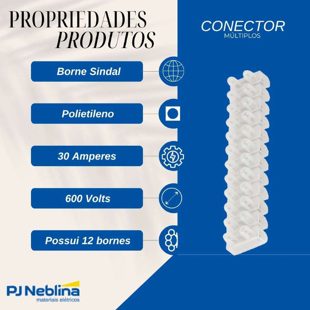 • Número de Bornes: Possui 12 bornes (terminais), permitindo múltiplas conexões em um único bloco.
