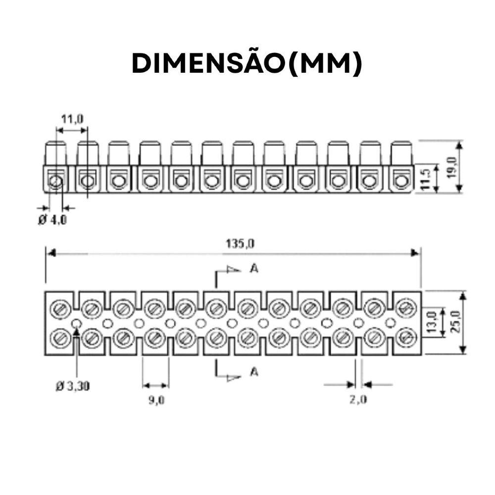 • Tipo: Conector múltiplo em barra (também conhecido como borne sindal).