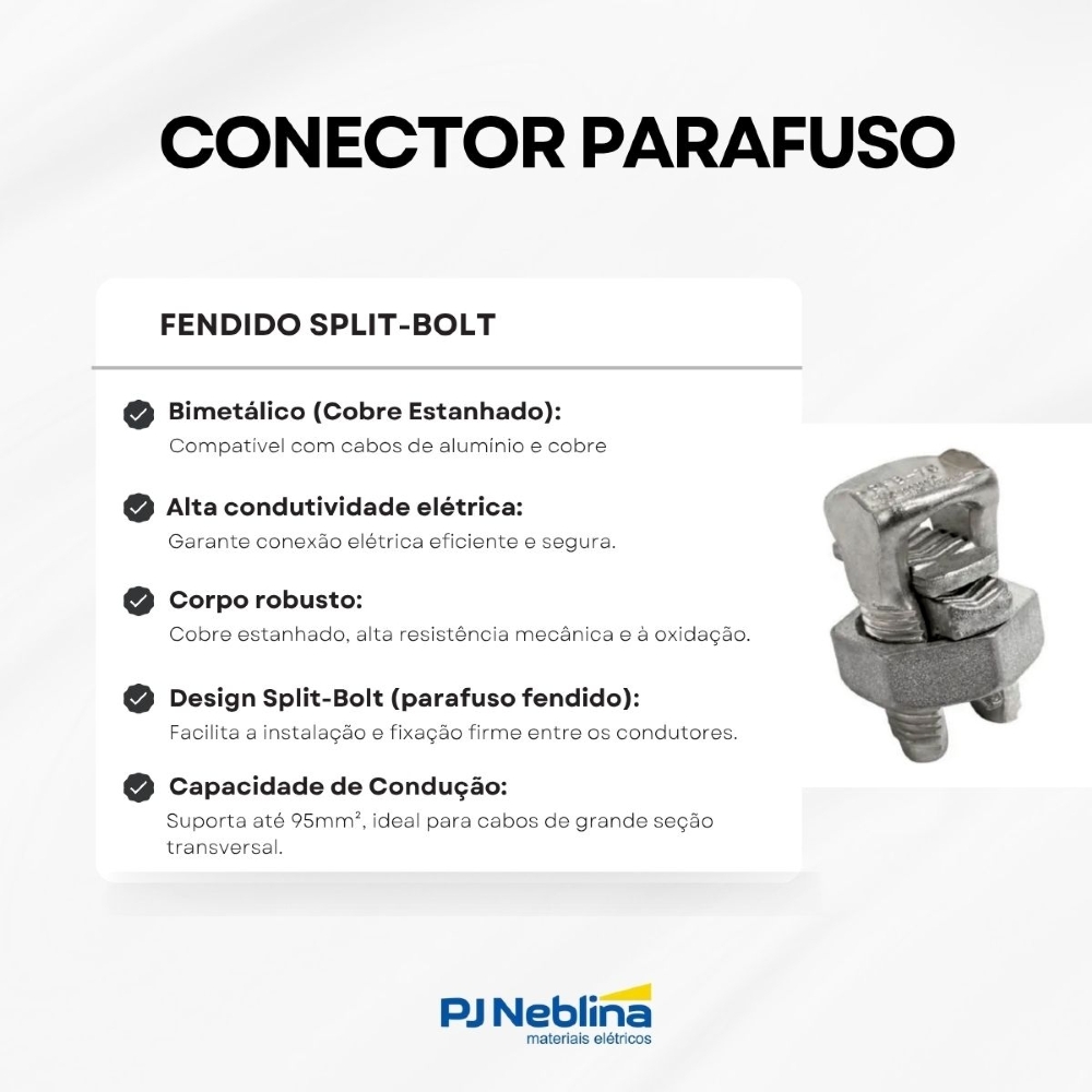 • Design Split-Bolt (parafuso fendido): Facilita a instalação e proporciona fixação firme entre os condutores.