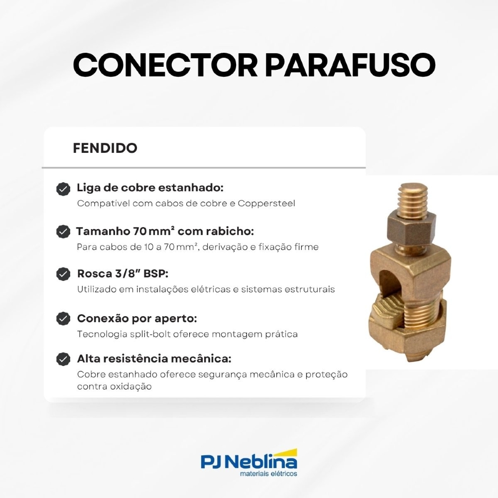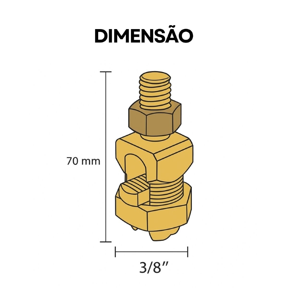 Tamanho 70 mm² com rabicho: adequado para cabos de 10 a 70 mm², permite derivação e fixação firme com porca no próprio rabicho