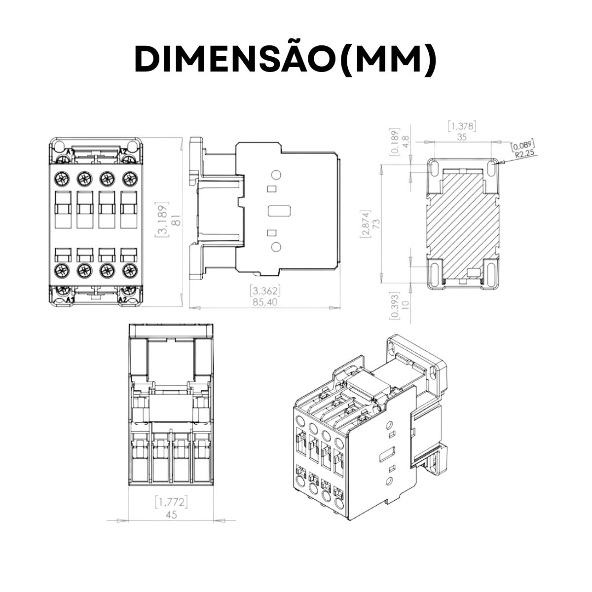 • Contato Auxiliar (1NA): Possui um contato auxiliar Normalmente Aberto (NA), que fecha quando a bobina do contator é energizada. Este contato é usado em circuitos de comando para sinalização, intertravamento ou para realimentar o próprio circuito de comando.