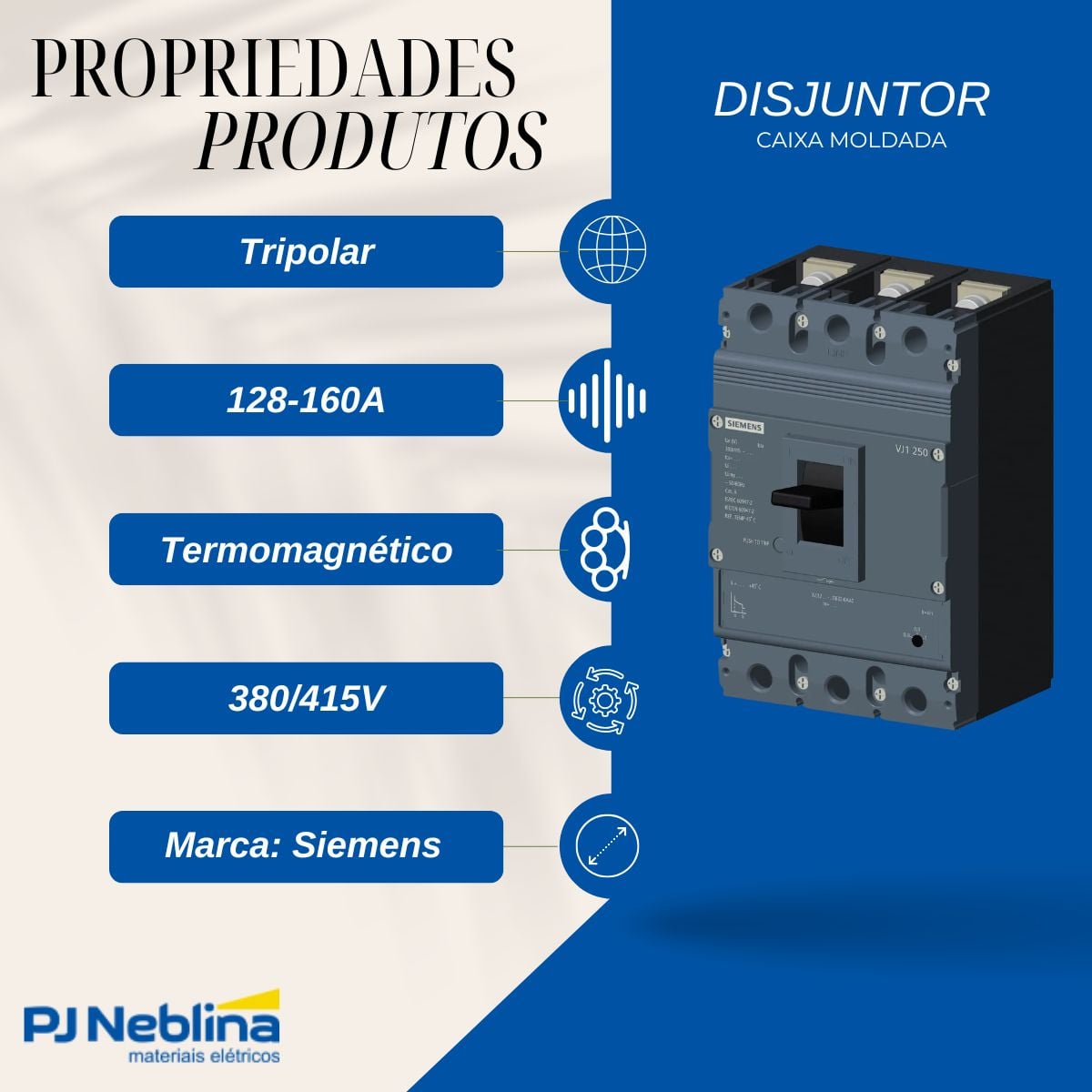 Disjuntor Caixa Moldada Tripolar 128-160A 25Ka 380/415V 50Hz - Siemens - Código Fabricante: 3VJ12163DB320AA0