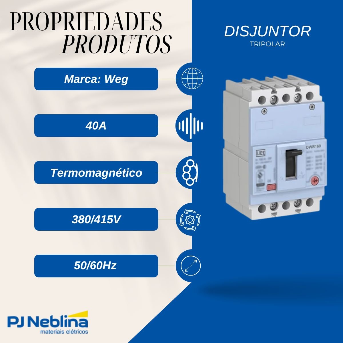 - Produto (WEG)Título: Disjuntor caixa moldada (MCCB) tripolar 40 A 30 kA 380/415 V 50/60 Hz