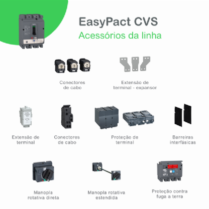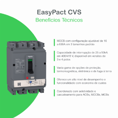 O EasyPact CVS100B é um interruptor, ou disjuntor, termomagnético fixo 3d de 3 polos com alto nível de desempenho e funcionalidade econômica. É uma escolha ideal para aplicações de proteção de edifícios pequenos e médios. A capacidade de ruptura (Icu) é de 25kA rms a 415VAC 50/60Hz. A tensão de operação é de 440 VAC 50/60 Hz. Este disjuntor inclui uma unidade de disparo TMD nominal de 63A. A unidade de desconexão TMD fornece proteção de sobrecarga térmica ajustável e proteção magnética fixa. Esta versão de 3 polos com dimensões de 105 mm (L) x 161 mm (A) x 86 mm (P) inclui uma variedade de recursos e acessórios opcionais. Além disso, pode ser instalado em painéis de interruptores de isolação de classe II, pois é um dispositivo frontal de classe II (IEC 60664-1). Este produto está em conformidade com as normas internacionais (IEC 60947, CCC, EAC). Os disjuntores termomagnéticos Easypact CVS levam o selo Green PremiumTM, que promete conformidade com as mais recentes regulamentações, transparência nos impactos ambientais, produtos circulares e de baixo CO2.