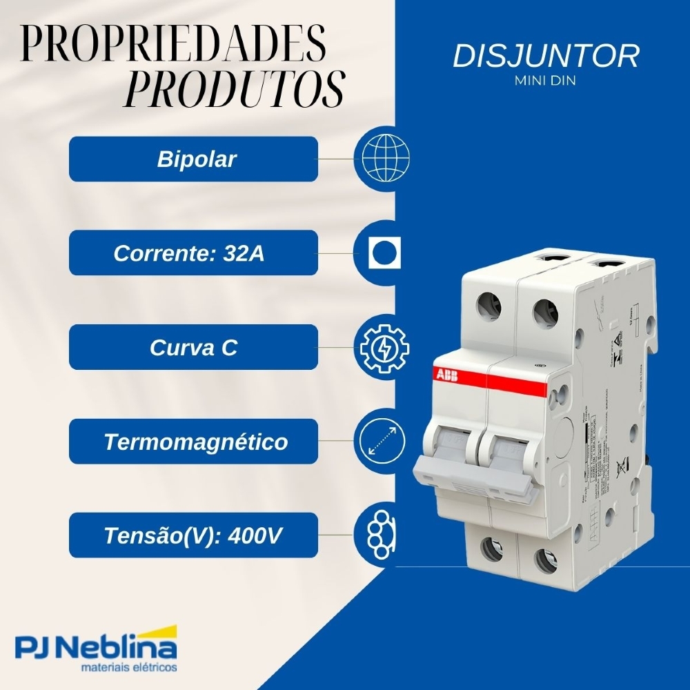 Sendo uma empresa líder no mercado global em tecnologia com mais de 130 anos de história, impulsionando a inovação, transformação e desenvolvimento de uma indústria para uma sociedade futura sustentável, a Abb une software ao seu portfólio de produtos para os segmentos elétricos, robóticos, automotivos, motores, geradores e acionamentos, expandindo os limites de tecnologia, qualidade e êxito para entregar o mais elevado desempenho aos consumidores. O Disjuntor Mini Din Bipolar 32A Curva C Termomagnético 6Ka 400V 50/60Hz Ip20 entrega a solução e a qualidade que você precisa.