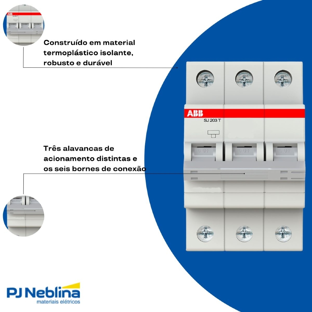 – Tipo: Disjuntor Miniatura (MCB - Miniature Circuit Breaker), com três polos (tripolar), projetado para proteger circuitos trifásicos ou três circuitos monofásicos independentes.