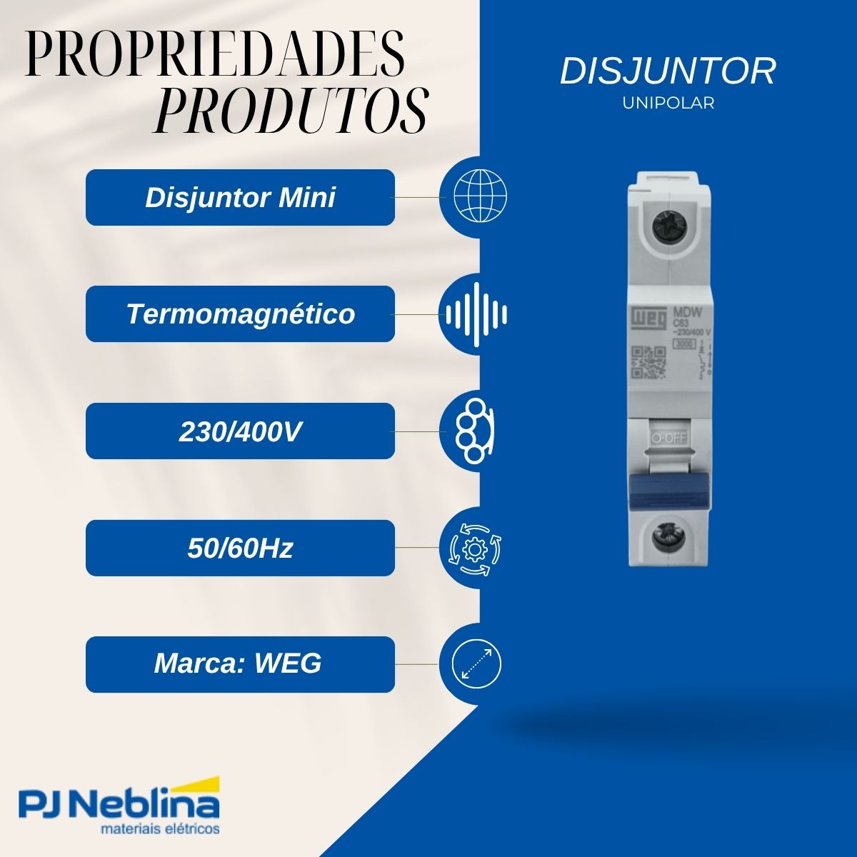 Disjuntor Mini Din Unipolar 63A Curva C 5Ka 230/400V - Weg - Código Fabricante: 15265694