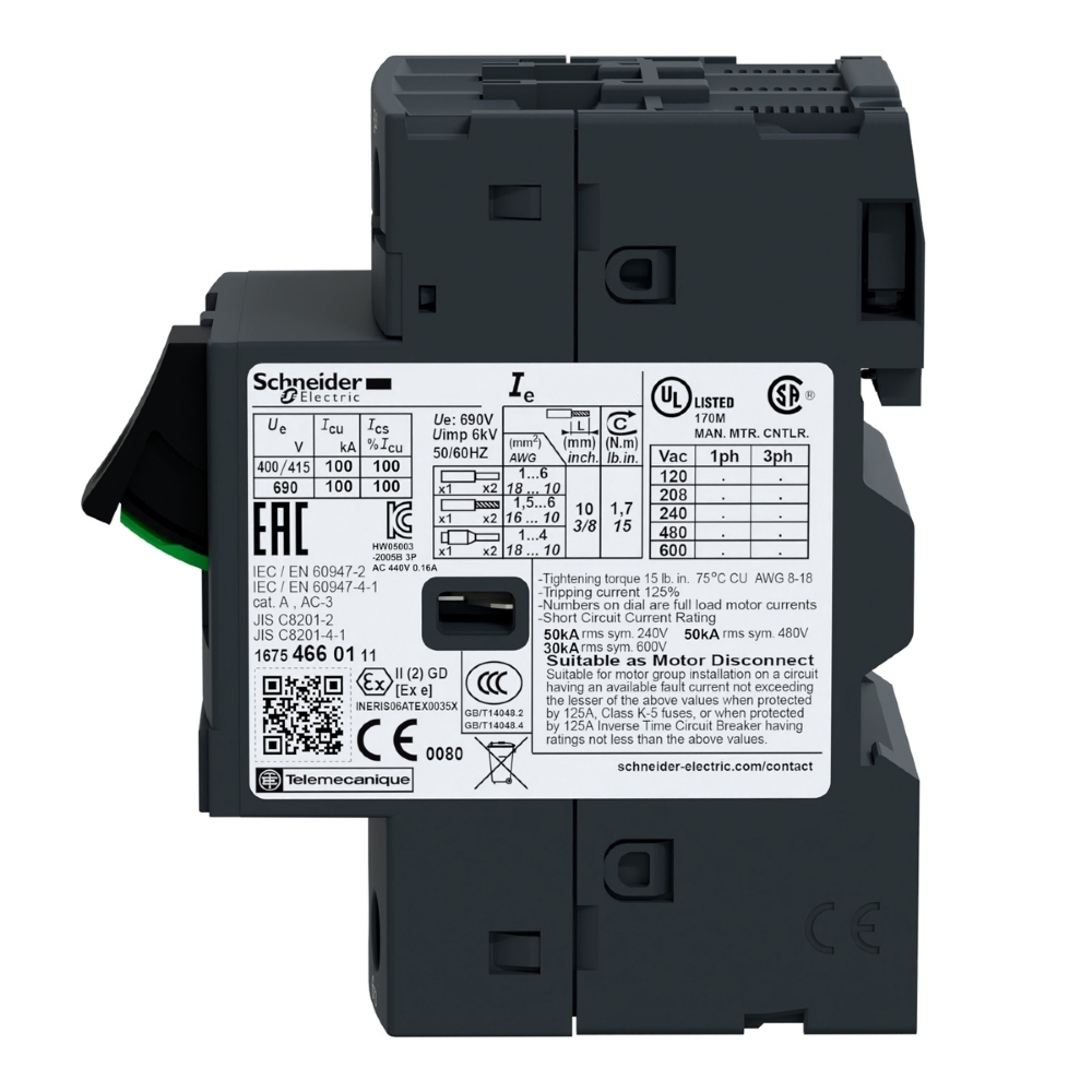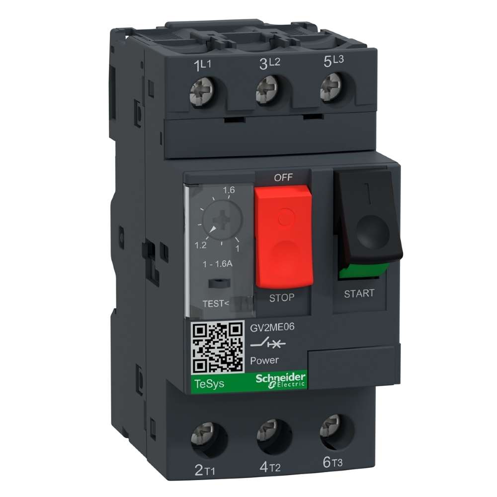 Disjuntor Motor Tripolar Termomagnético 1,6A 1-1,6A 400/415V 100Ka 400/415V 50/60Hz GV2ME06 - Schneider Electric