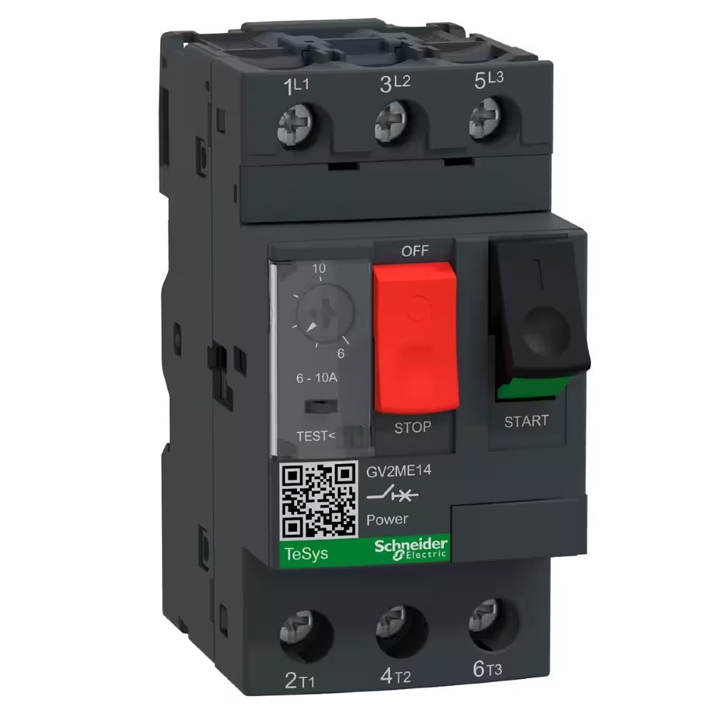 Este produto possui 3 polos, capacidade de 6-10A/690V e está destinado para aplicações de motor trifásico 3-4kW/400V. Fornece uma proteção termomagnética com uma gama de regulação térmica 6-10A, disparo magnético a 9xIn e alta capacidade de ruptura Icu 100kA/400V. Além disso, conta com proteção IP20 e conexão por meio de terminais de parafuso. Também permite o controle de inicio/parada por botão de pressão garantido por 100.000 ciclos AC-3.