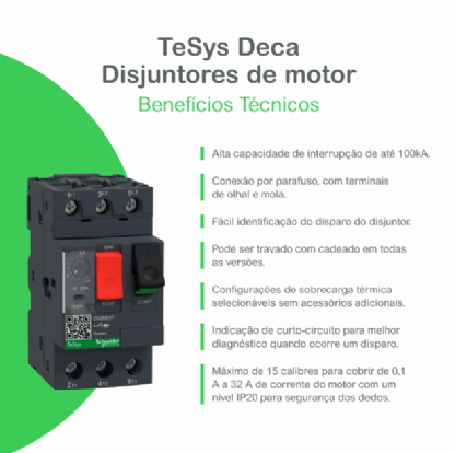 As novas gerações de disjuntores motores TeSys Deca - frame 2 oferecem uma solução completa para quase todas as aplicações. Ele fornece proteção contra curto-circuito, proteção contra sobrecarga e controle do motor (ON/OFF).