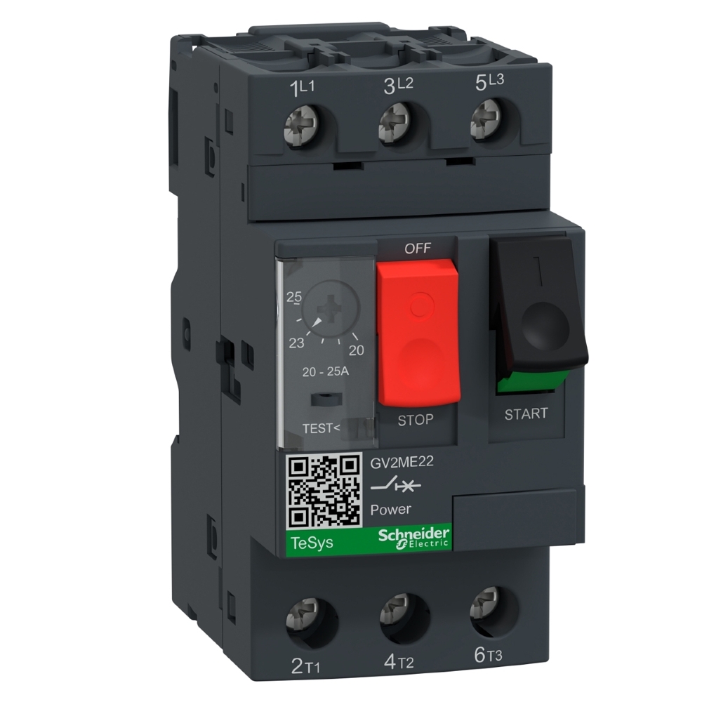 Este produto possui 3 polos, capacidade de 20-25A/690V e está destinado para aplicações de motor trifásico 11kW/400V. Fornece uma proteção termomagnética com uma gama de regulação térmica 20-25A, disparo magnético a 9xIn e alta capacidade de ruptura Icu 15kA-400V. Além disso, conta com proteção IP20 e conexão por meio de terminais de parafuso. Também permite o controle de inicio/parada por botão de pressão garantido por 100.000 ciclos AC-3.
