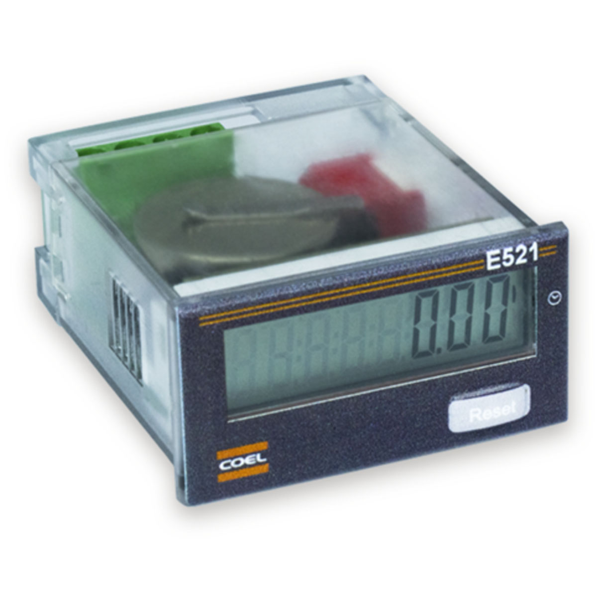 O Totalizador de impulsos/horas E521 é um instrumento versátil e de fácil programação. Não necessita de alimentação externa, pois possui uma bateria de Lithium com carga para 5 anos de uso (aproximadamente).