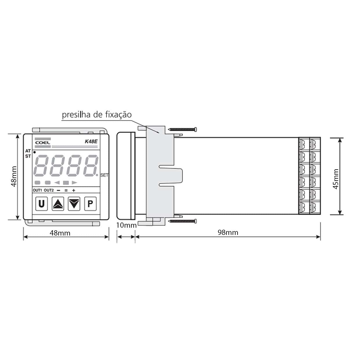 O controlador de temperatura K49E é instrumento de fácil programação. Trabalha com sinal de entrada de termo elementos tipo J, K, S, R, T ou termo resistência Pt100. A temperatura do processo é visualizada através de um display a LED com 4 dígitos e controlada por uma saída a relé ou tensão (para SSR). O segundo display é utilizado para visualização do set point de controle. O controle é tipo ON/OFF ou PID, selecionado através do teclado frontal.