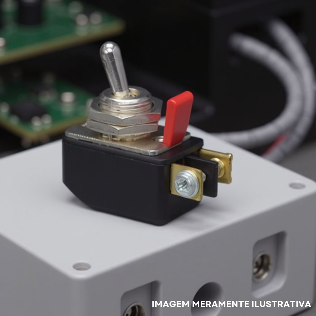 – Tipo: Interruptor de Alavanca (Toggle Switch). Possui um atuador em forma de alavanca que é acionado manualmente para alternar entre as posições.