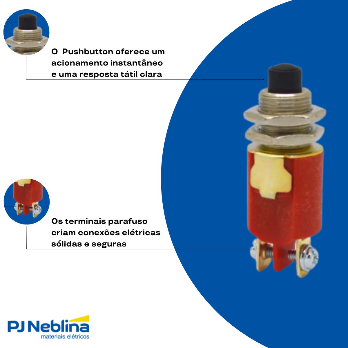 – Funcionamento: Momentâneo. O contato muda de estado apenas enquanto o botão é pressionado, retornando ao seu estado original (NF) assim que a pressão é liberada.
