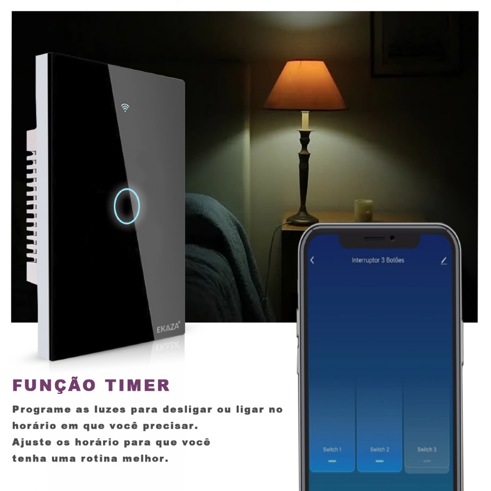 Ligue e desligue as luzes com apenas um toque em seu smartphone de qualquer lugar e a qualquer hora, com uma tecnologia de ponta, o interruptor trabalha com a economia de energia trazendo mais comodidade, com o sistema de WiFi você pode desativar as luzes quando não estiverem em uso. Programe as luzes para desligar ou ligar no horário em que você precisar, ajuste os horário para que você tenha uma rotina melhor.