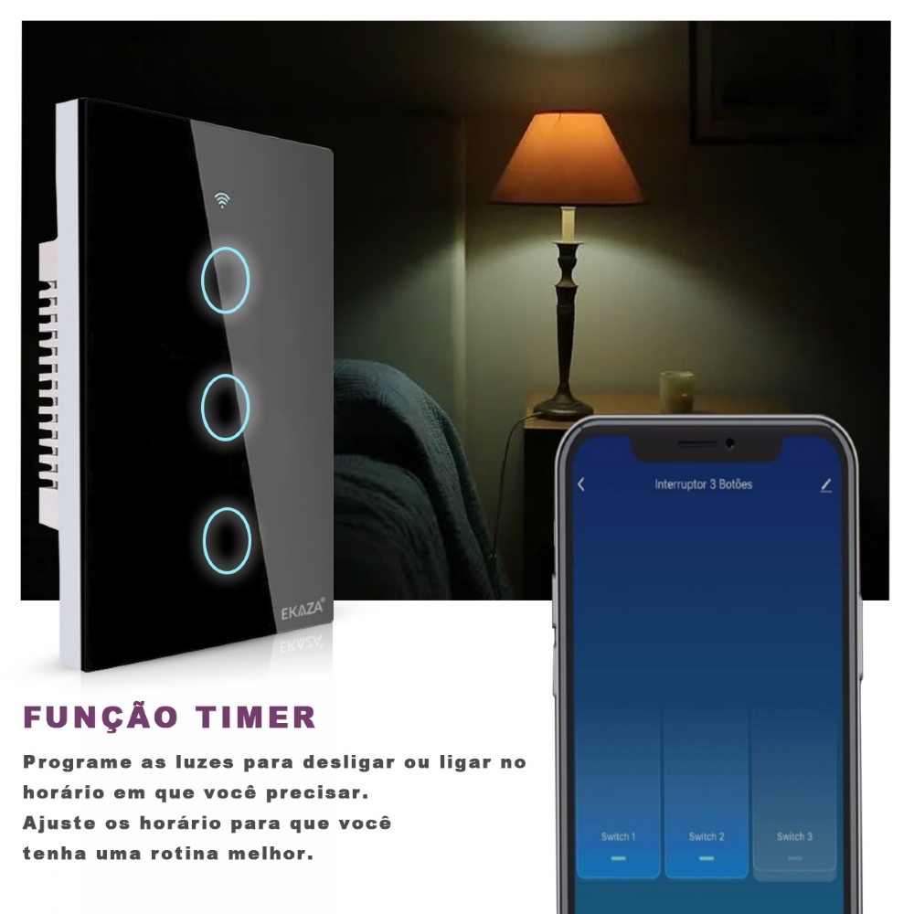 Interruptor Smart Touch Screen 3 Botões Google Alexa Preto Casa Inteligente Ekaza