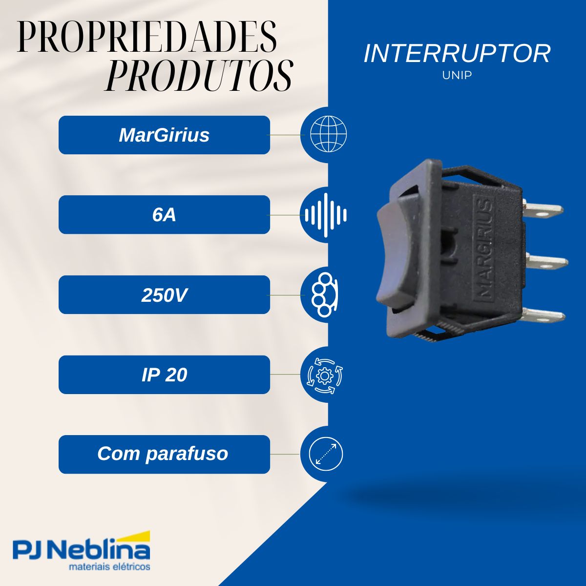 Interruptor Unip Liga / Desliga Preto 6A 4 Garras - Margirius - Código Fabricante: PA009276
