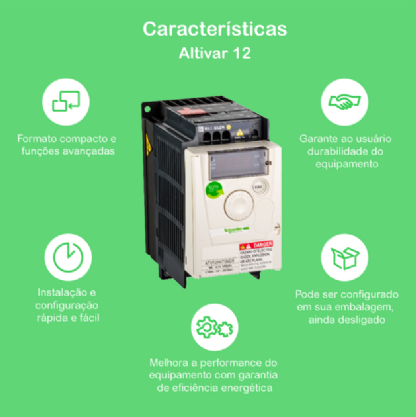 Com mais de 180 anos inovando e fazendo história a Schneider Electric continua criando e desenvolvendo tecnologias inovadoras de confiabilidade, eficiência e de forma sustentável. Com o Inversor De Frequência Atv12 0,75Kw 200/240Vca Monofásico você aproveita o que tem de melhor da nossa tecnologia.