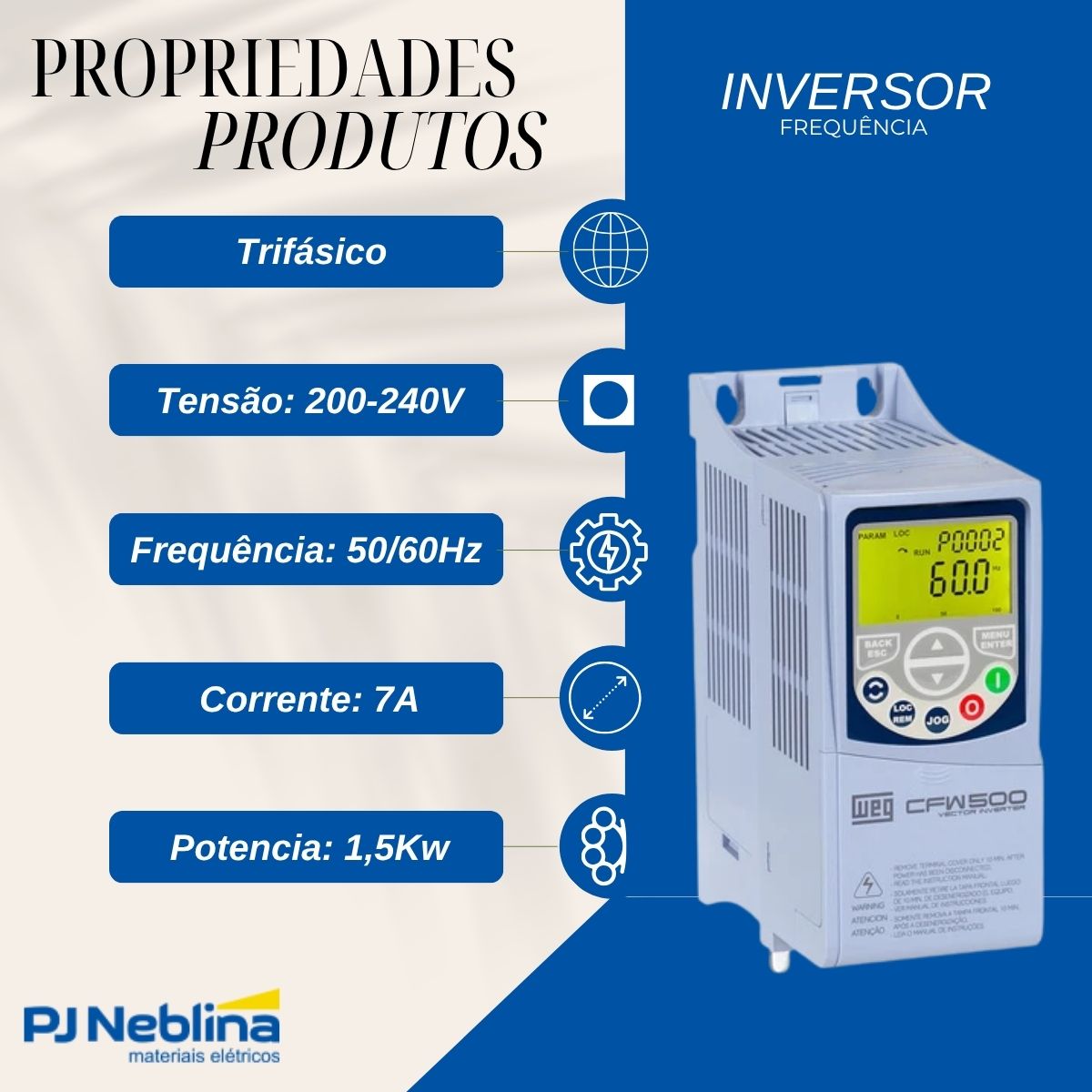 Potência Nominal: 1,5 Kw (quilowatts). Esta é a potência máxima do motor elétrico trifásico que este inversor é capaz de acionar e controlar de forma eficiente. É uma potência relativamente baixa, adequada para motores menores.