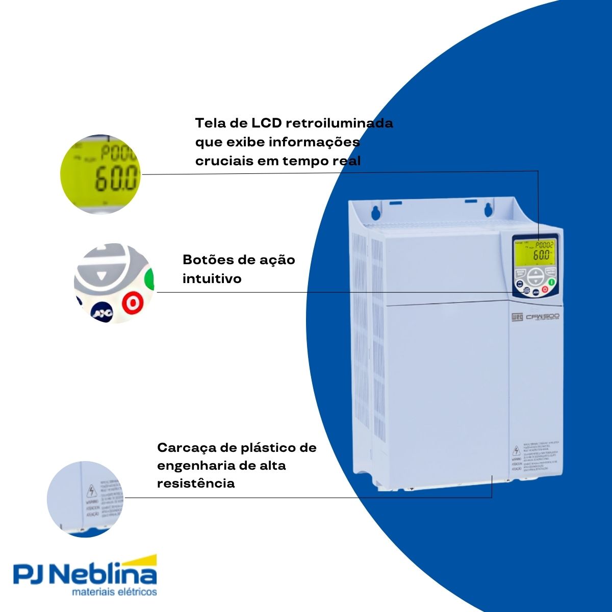 Inversor Frequencia | Fase: Trifasico | Tensao (v): 380-480v | Frequencia(hz): 50/60hz | Corrente(a): 39a | Corrente Hd(a): 39a | Potencia(kw): 22kw | Potencia Hd(kw): 22kw | Grau Protecao: Ip20 | Marca: Weg | Referencia: Cfw500e39p0t4db20g2 | Linha Fabr.: Cfw500