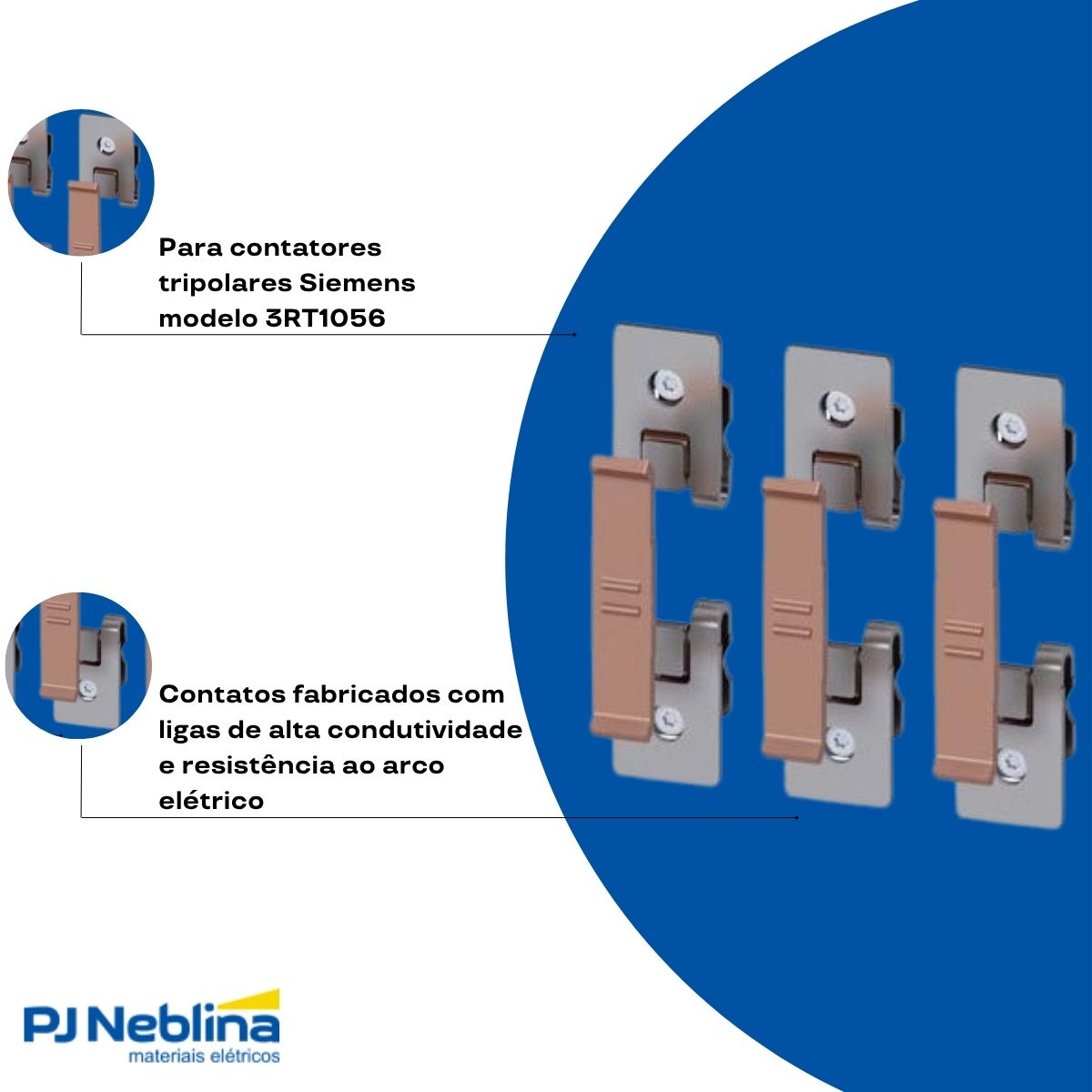 - Material: Ligas de prata ou materiais de alta condutividade e resistência ao arco elétrico.