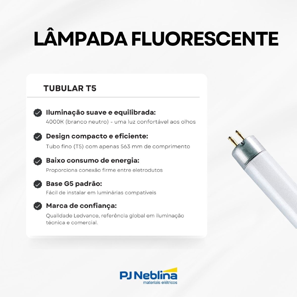 • Design compacto e eficiente: Tubo fino T5, com apenas 563 mm de comprimento, compatível com luminárias modernas e discretas.