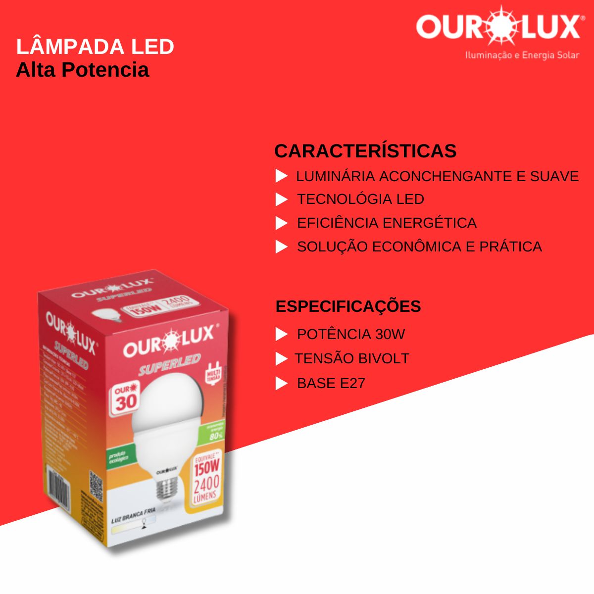 • Eficiência Energética: Consome apenas 30W, oferecendo uma iluminação potente sem desperdício de energia.