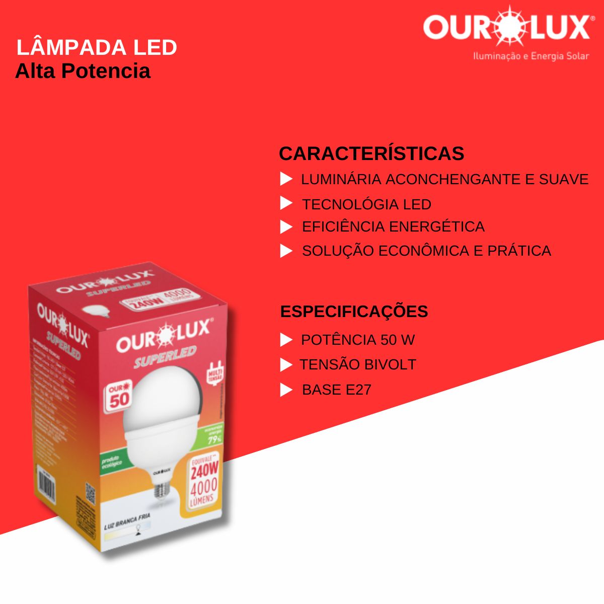 • Eficiência Energética: Consome apenas 50W, oferecendo uma iluminação potente sem desperdício de energia.