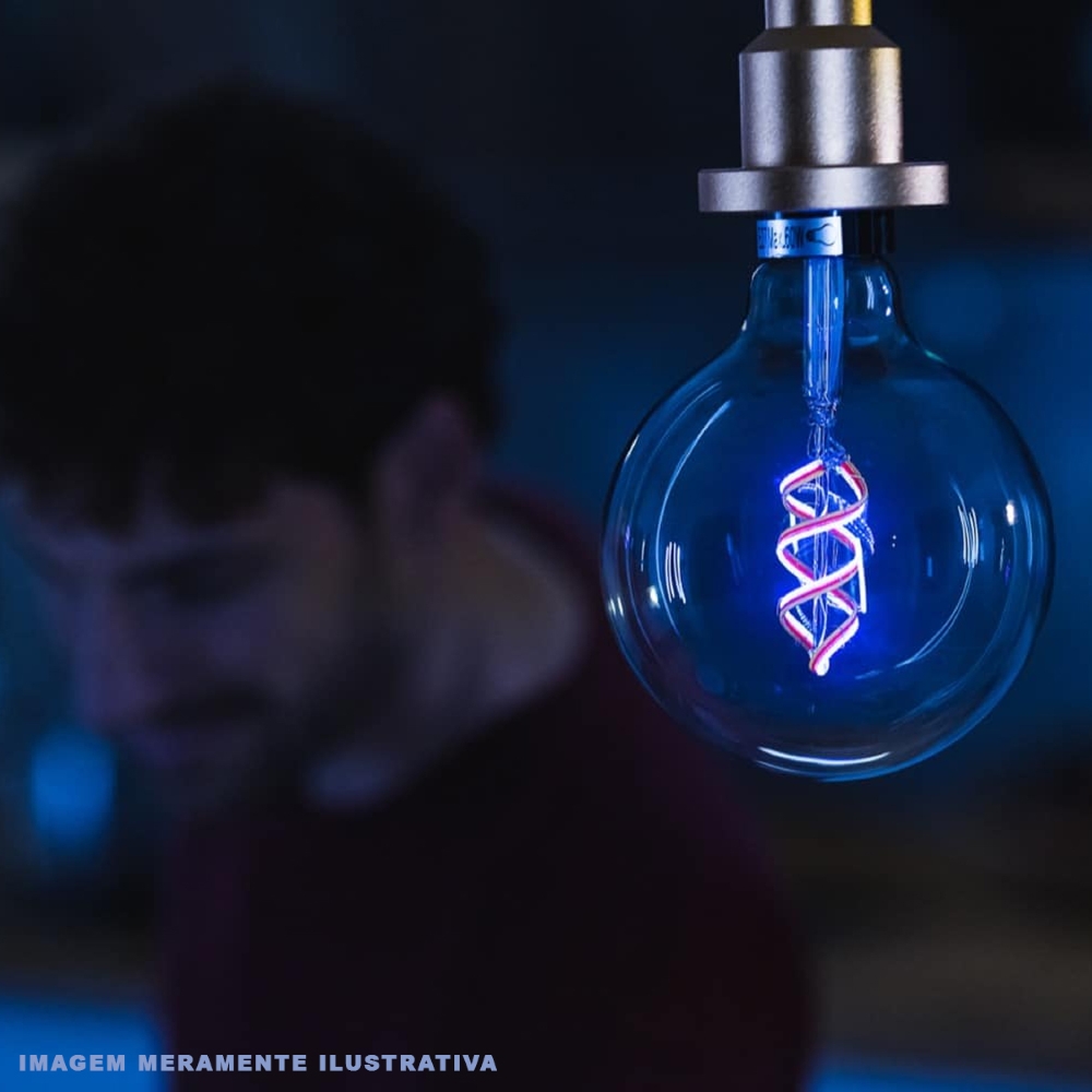 em vidro e o seu filamento em LED. Reproduz todas as Cores do RGB e também, branco de 3000K.