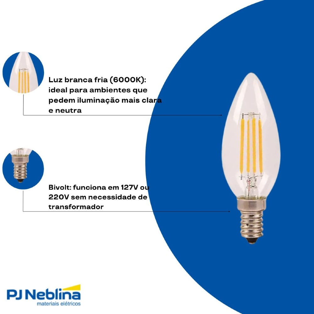 Lâmpada Led Filamento Vela 3W Bivolt E14 6000K Luz Branca - Ourolux